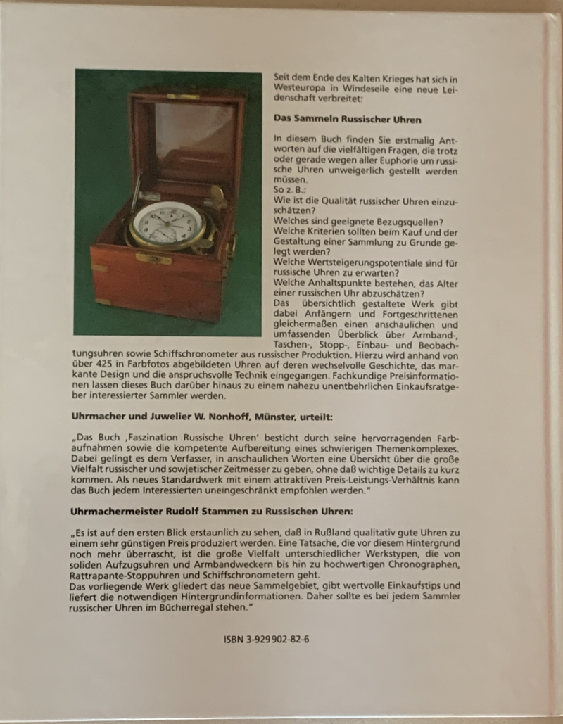 General impression: Book gives a first impression what one can expect from soviet/russian watch production. It was written in the time when all ex. Soviet Union watch companies were still active and it is more an overview what was available at that time. No special collectior's items are described. For real USSR watch collectors not of a pariticular use, but general population might read it with interest.
