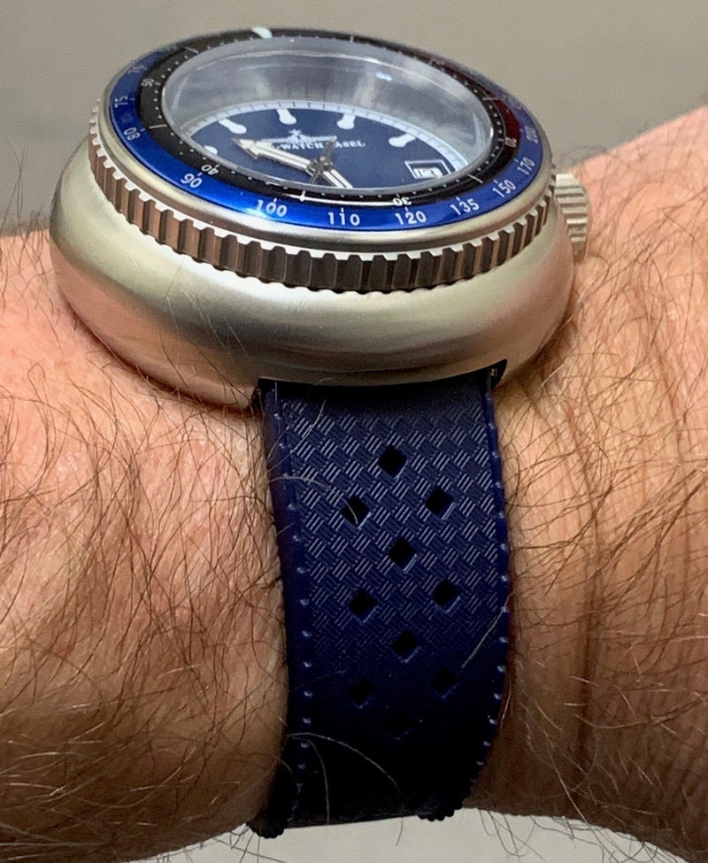 My next attempts were much more successful — this time with a rubber (silicone) strap. I only had a grey 22 mm strap, but it immediately showed me that rubber could be a very good option. I also have a similar strap in blue, which would have been a perfect color match, but unfortunately it's only 20 mm wide. I wore the watch for a few minutes with that blue strap, and the overall feel was great. But the 2 mm gap between the strap and the lugs bothered me, so I decided to try something else.
