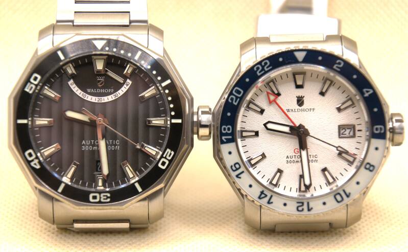 What I like about both watches is the fact that the dials are not overcrowded with text. There’s just the Waldhoff logo below the 12 o’clock position and a simple “Automatic 300m / 1000ft” marking — both using the same font on each watch. The Atlas also includes a discreet “GMT” label.