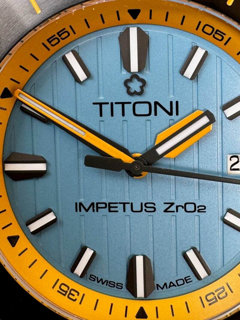 I need to say a few separate words about the dial, because everything on it is executed just perfectly. The base color is in perfect harmony with the case, and the straight lines on the dial echo the shape of the case. The hour indexes are exceptionally well designed, with the four main indexes shaped to match the hour hand. The only thing that slightly bothers me is the TITONI text, which is, in my opinion, too large—especially considering that the logo is already present. The font size used for IMPETUS ZrO₂ would have been more than sufficient for TITONI as well. That said, I quite like the zirconia reference on the dial; after all, this is the most unique and defining feature of the watch.
