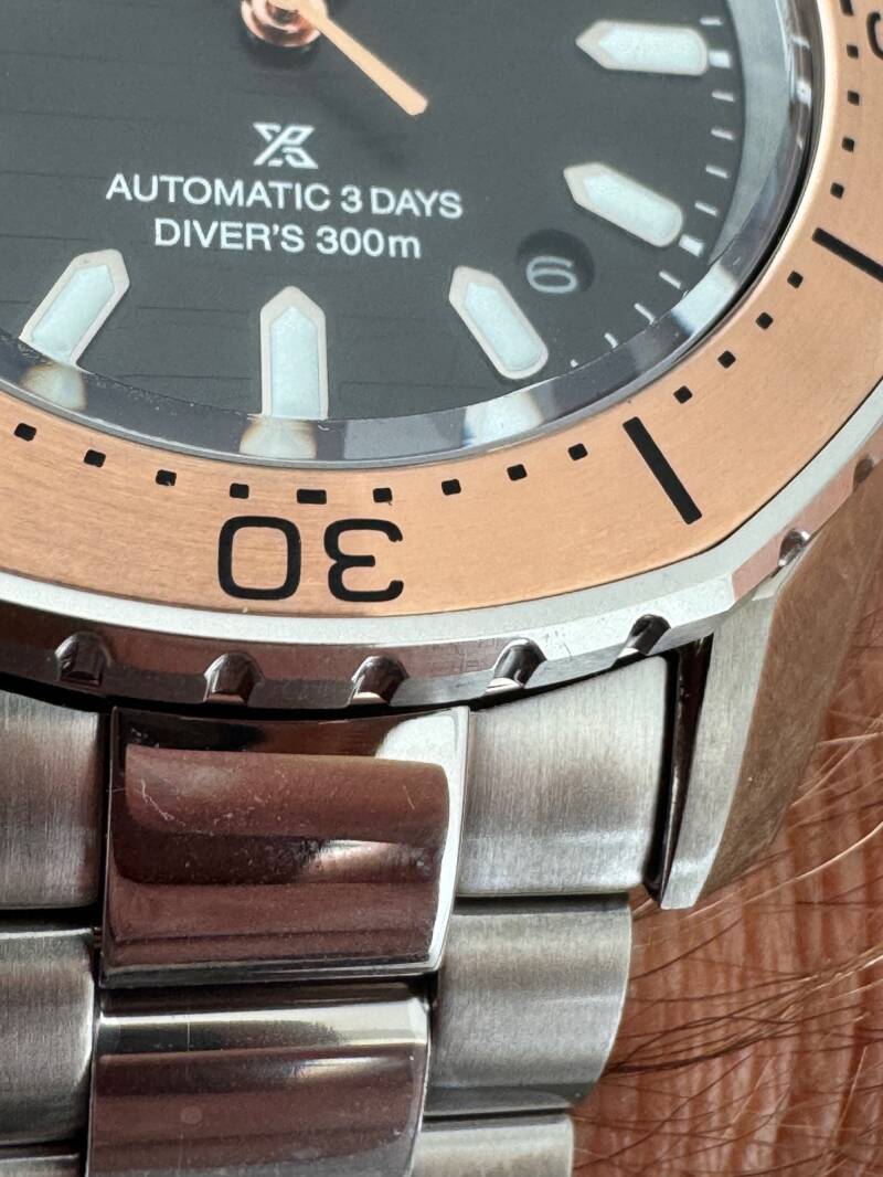 And… good news! The bezel is properly aligned. Well, mostly. It’s a bit complicated. The sapphire crystal (yes, sapphire—not the usual Hardlex mineral glass Seiko loves to use) isn’t flush with the bezel. It’s slightly domed and angled, which creates optical distortions depending on the angle you're looking from. In the photos below, you’ll see how the same bezel setting can look differently aligned depending on the viewing angle.