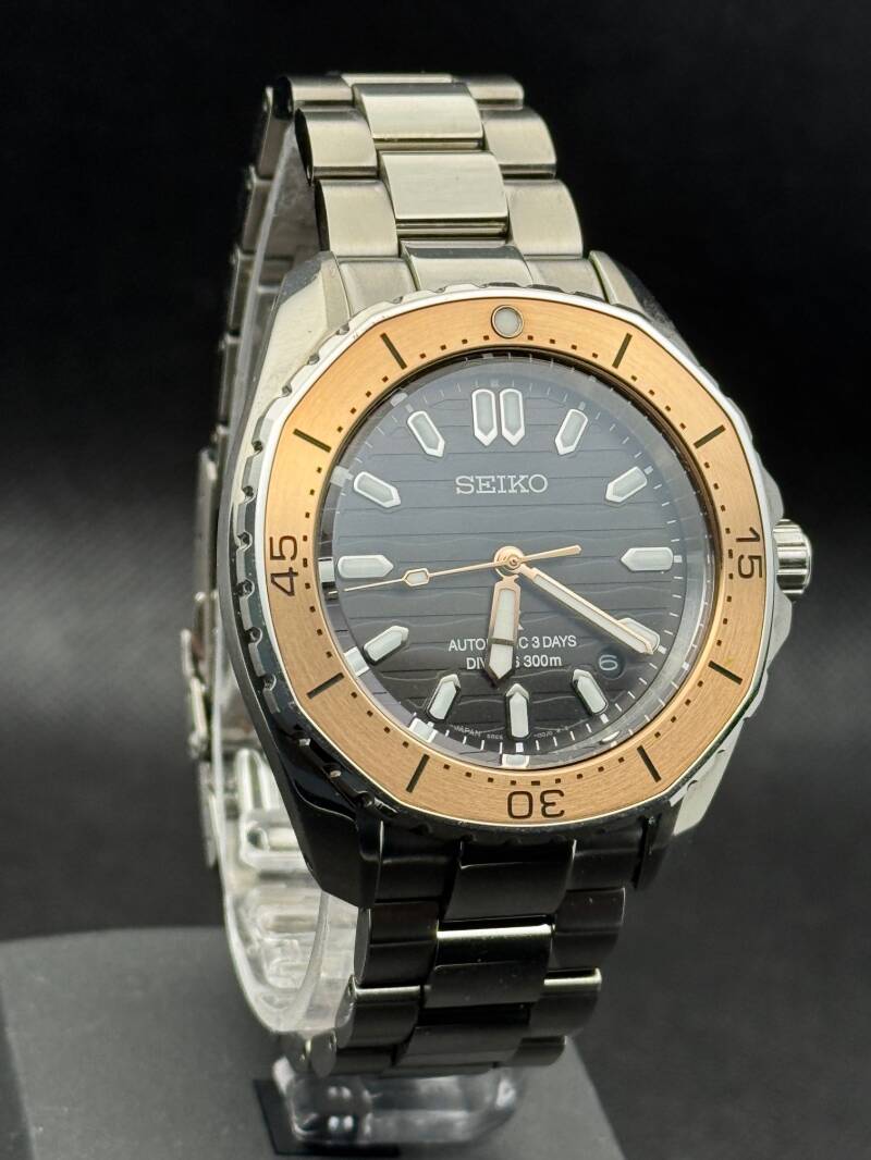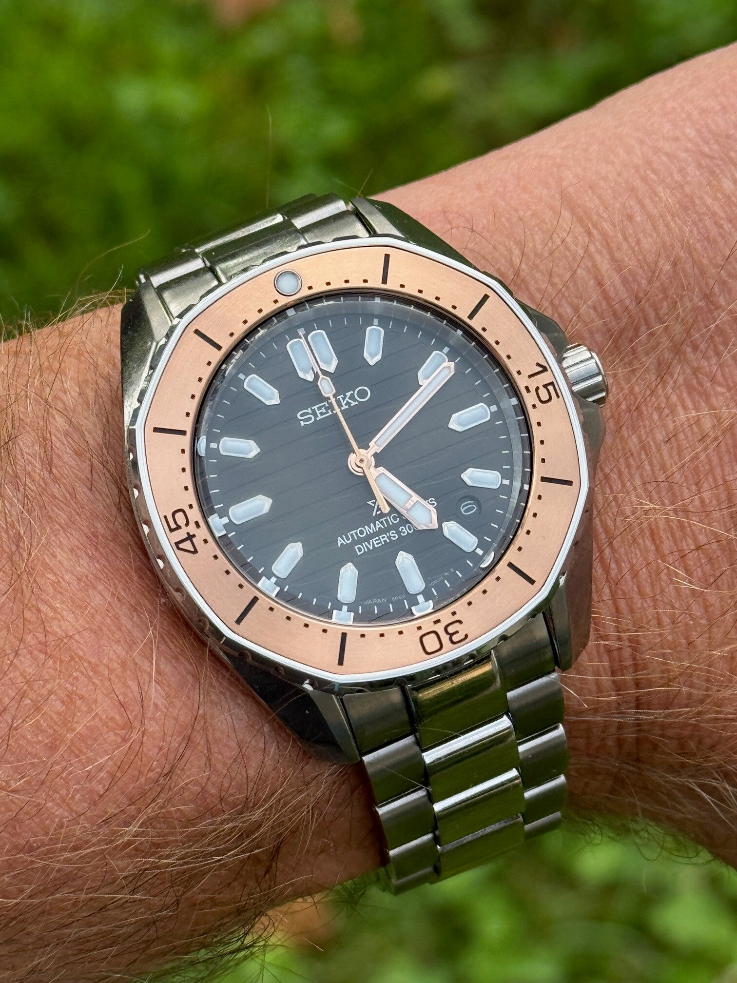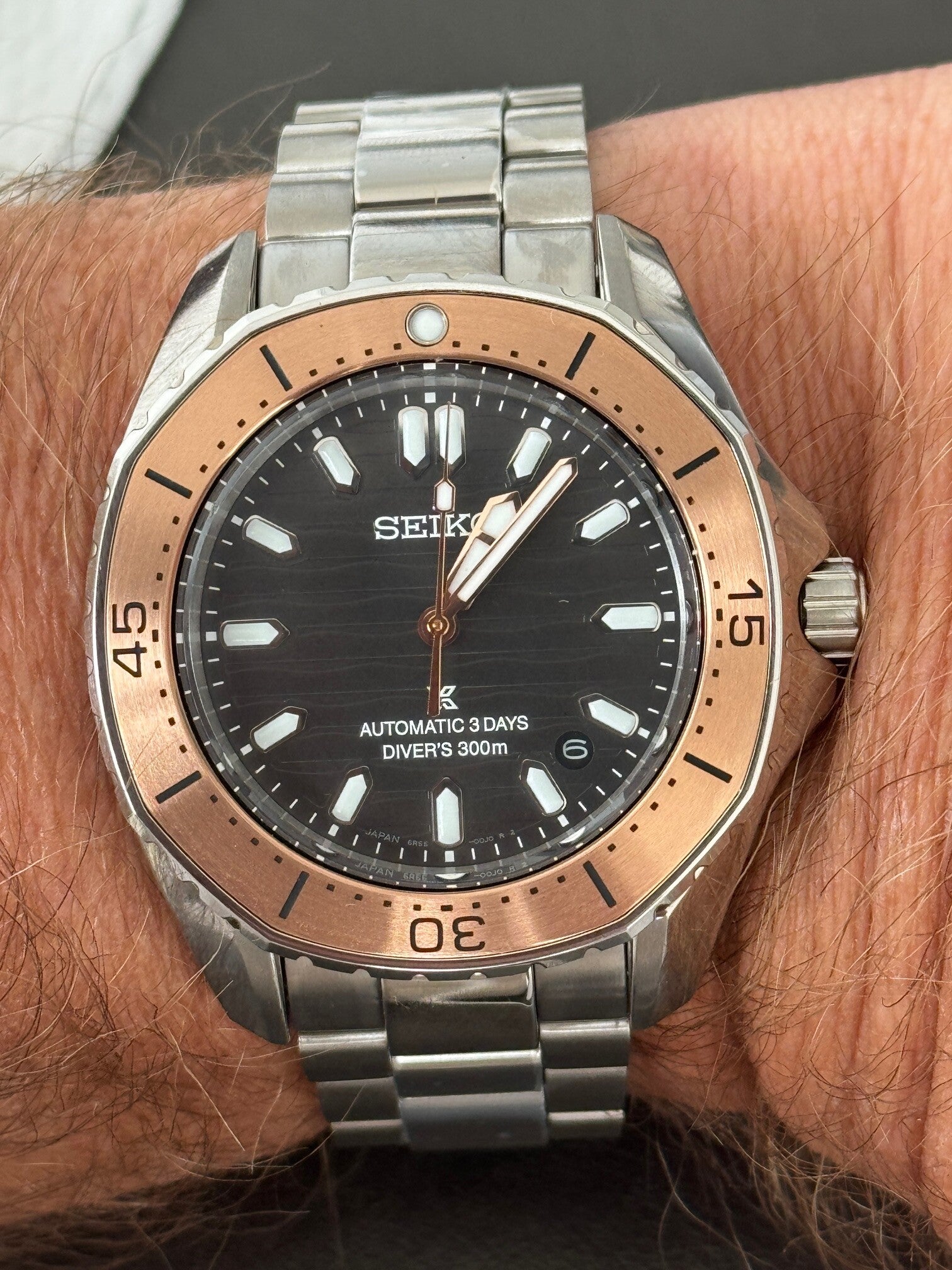 Because for once, I felt like Seiko actually did something a bit different. A bit fresh. A bit outside their usual comfort zone. The main reason? That bezel. It’s octagonal… or maybe even dodecagonal? (You be the judge.) And what really caught my eye is the color combo: a copper colored steel bezel insert over a black dial, with copper-edged hands spinning above it. I just really dig the overall vibe.