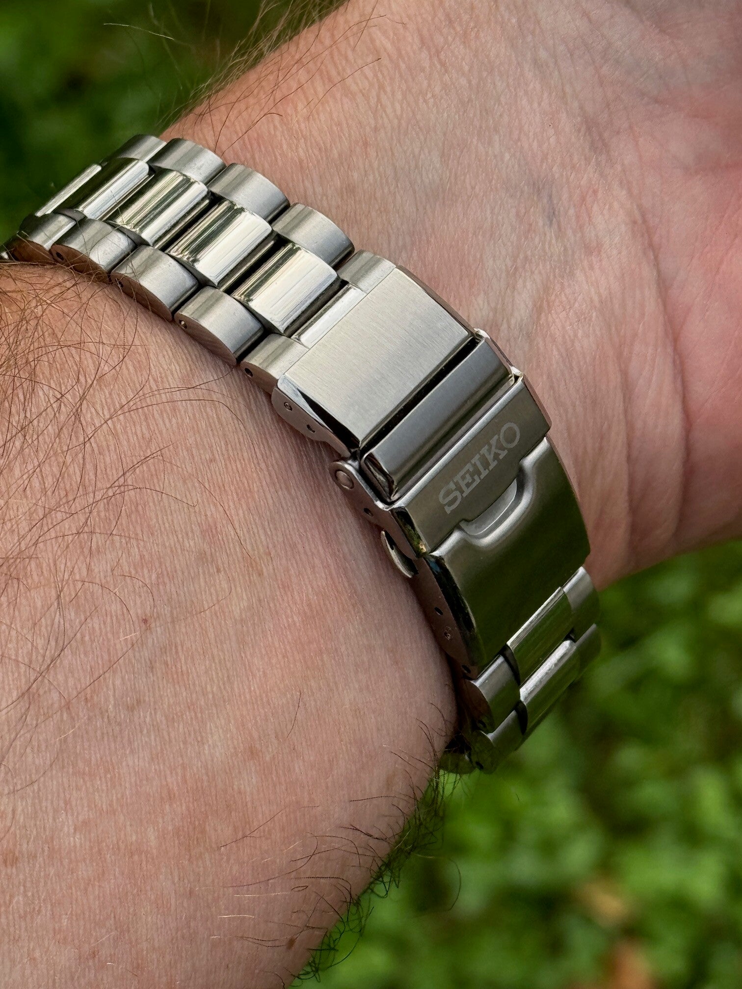 Now, if I like the case, I absolutely don’t like the bracelet. The disappointment starts right at the lugs—there’s a visible gap between the end links and the case. It looks… bad. I don’t know if Seiko thinks their customers don’t care, or if there’s some technical reason behind it, but either way—it’s not okay. Then there’s the clasp and diver extension. One micro-adjustment hole. That’s it. And the diver extension? Clunky. Fixed position. Useless for minor wrist size changes throughout the day. Compared to modern extensions that slide smoothly and offer multiple settings, this is prehistoric.