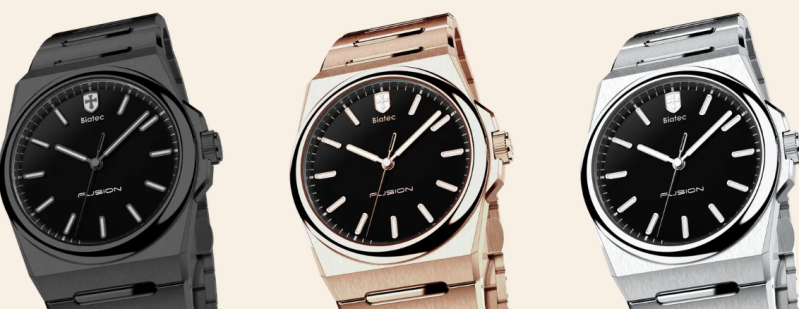 The second model, Fusion 02, comes with a rose gold PVD coating, while the third, Fusion 03, features a black DLC coating. All three models can be seen below (pictures are taken form the official Biatec website).