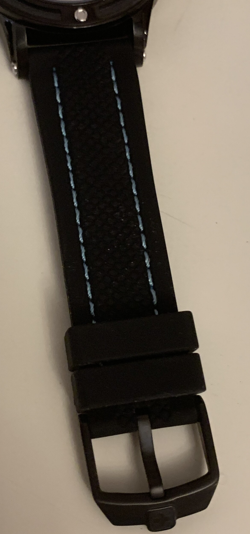 OK, now let me start with the watch itself. As said at the beginning, the main reason I bought the watch was the very nice combination of a light blue inner ring and the black tile-like texturing of the dial. And the wonderful rubber strap, which gives the impression of being leather.
