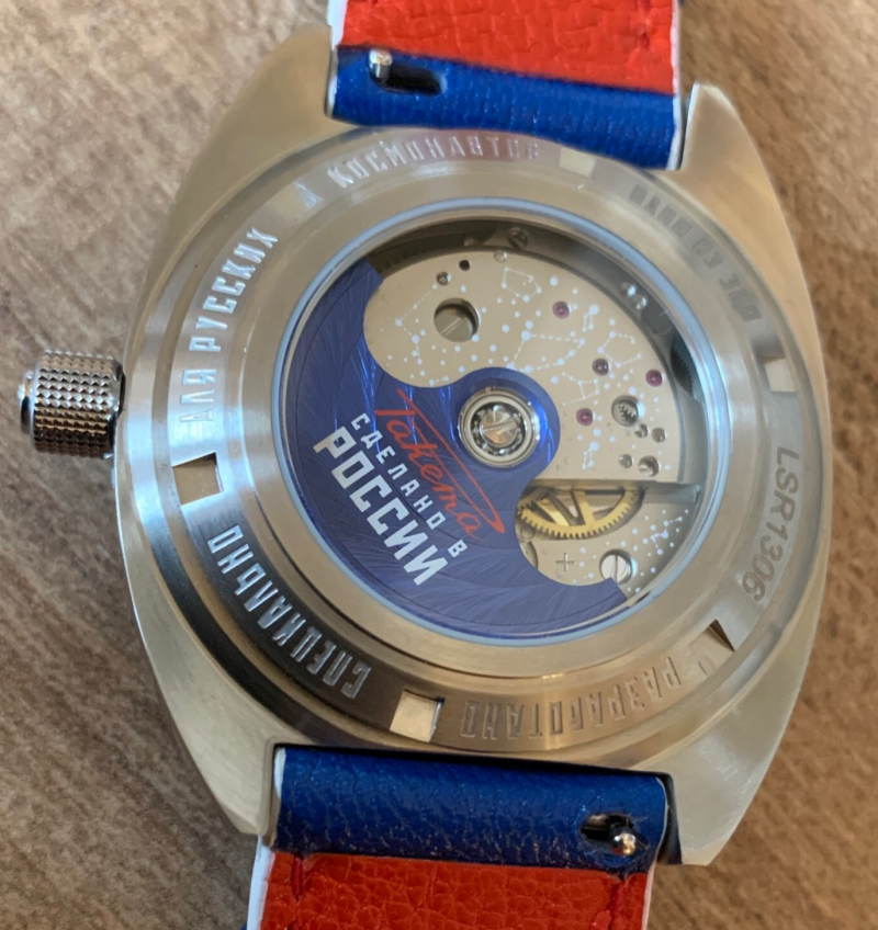 The front face of the Space Launcher is inspired by Gagarin’s legendary first space flight. Printed on the sapphire crystal is the iconic phrase "Poehali!"—meaning "Let’s go!"—which he shouted at liftoff. (If you remember, that same phrase appears as a decorative engraving on the movement of the Baikonur.)