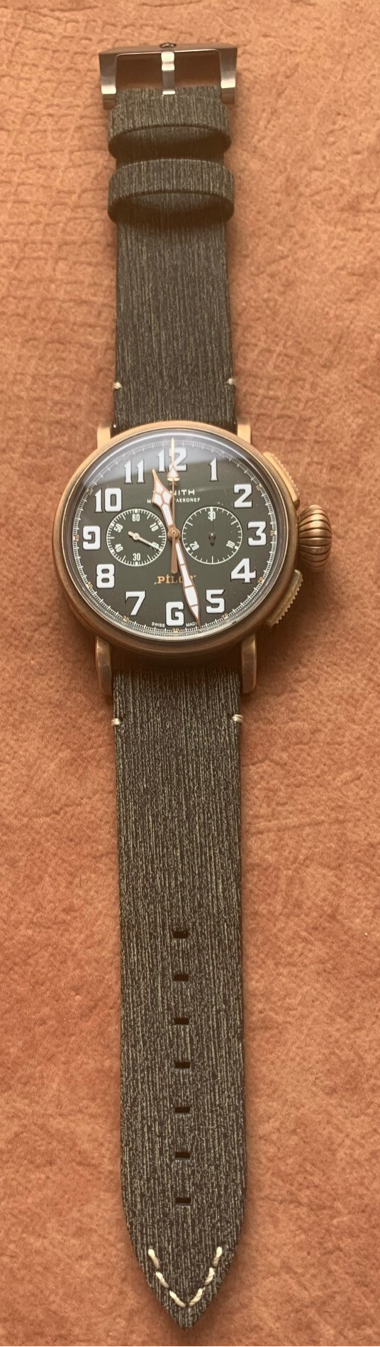 The dial is marked with “MONTRE D’AÉRONEF” beneath the ZENITH logo, and there’s an orange “PILOT” inscription above the 6 o’clock position—yet another color on the dial. Still, the orange does echo the warm tone of the rose gold hands or the bronze case to some extent; without that connection, the dial might have ended up looking too busy with so many different colors.
