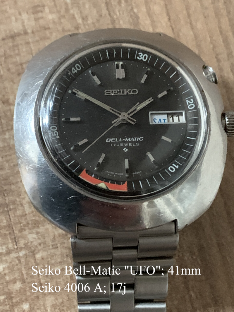 Seiko entered into the alarm mechanical movement world in the mid sixties when it's first alarm movement 4005 A was introduced. It is the movement with two spring barrels, watch barrel has an automatic winding (and only automatic, hand winding is not possible!) whereas alarm barrel is hand winded. Tone spring is used for the ringing. For the alarm setting Seiko use very unusual approach, instead of "standard" alarm hand or disc here alarm disc is integrated into bezel. Movement has 27 jewels and has also a date complication. This movement is relatively rare since it was very soon replaced by 4006 A model which also has 27 jewels and in additon to 4005 a day of the week complication is added. The number of jewels were latter reduced to 17, so later 4006 A models have 17 instead of 27 jewels. I have seen also some watches with 21 jewel mark on the dial but I can't confirm that this is correct number in the movement. I have also seen watches where 17j was declared in the dial but on the rotor of the movement 27j was noted.