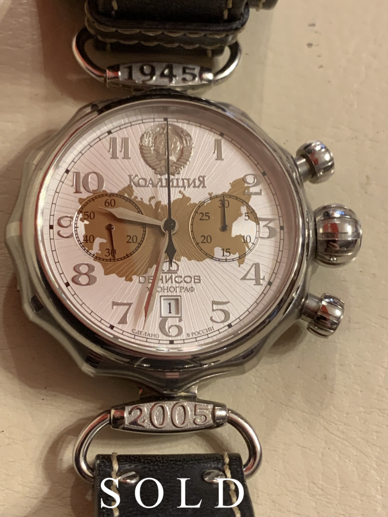 Vladimir Aleksejevič Denissov was one of the chief engineers in Poljot, he had an important role in transformation of Valjoux 7734 to Poljot 3133 chronograph movement, he also had a leading role in developing Poljot's quartz movement. In modern Russia he decided to establish his own company with his own brand Denissov. Denissov brand represent itself as "Since 1951", but my guess is that this could be a year when Denissov joint the 1MČZ (Poljot company). I am sure that Denissov company and brand did not exist in the USSR.