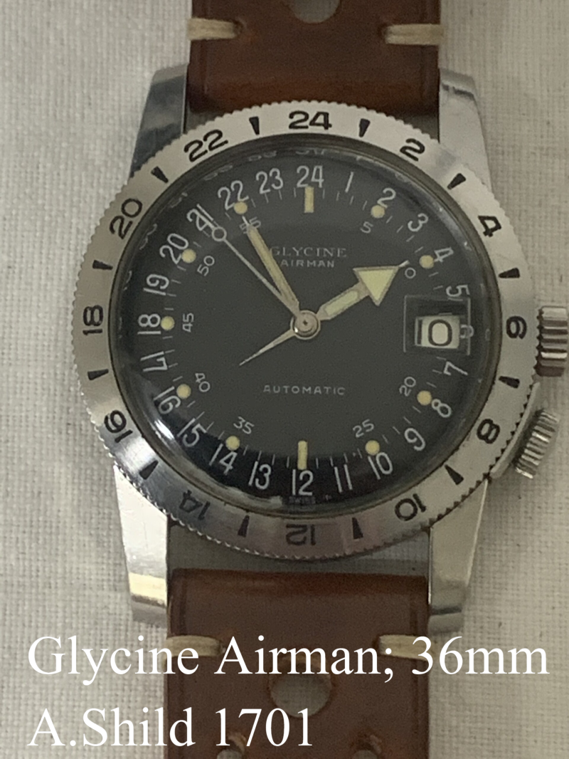 Glycine Airman was released in the mid fifties and was a very popular watch among US military personal. At first Felsa 692N movement was used, then from 1963 A.Shild 1701 followed by A.Shild 1702 and 1703. The backplate changed together with the movement change. From 1967 on the dial above the Glycine sign also the Glycine hallmark (crown) was printed.